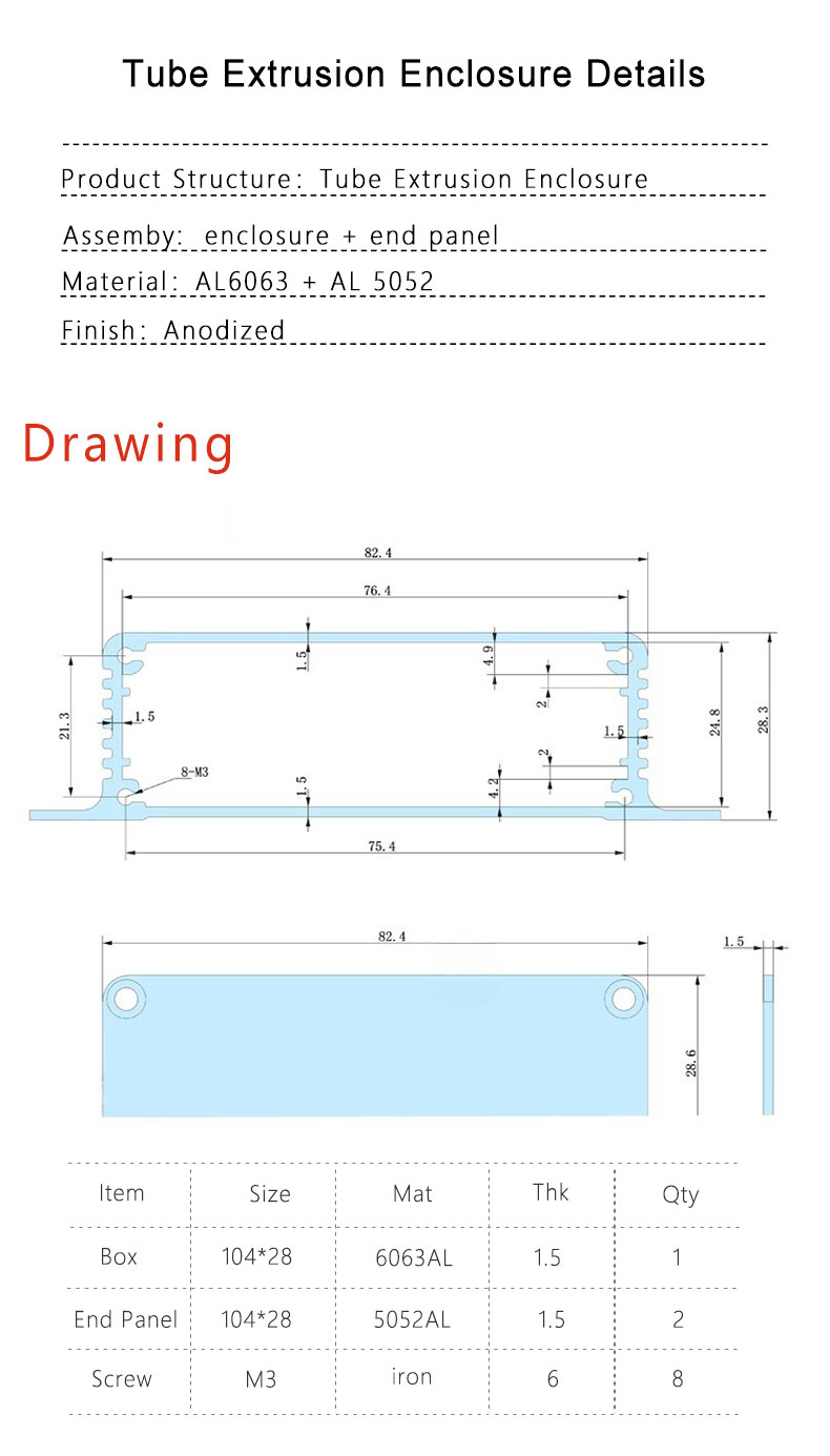 NO. AF006 Brand : PUMAY External dimensions: 104x28x L mm /4.1''x1.1'' x L '' ( W*H-L ) Structure : Tube aluminium enclosure china Package weight: 0.2 KG Unit Price : 1-5 USD / set Place of origin : Foshan , Guangdong, China