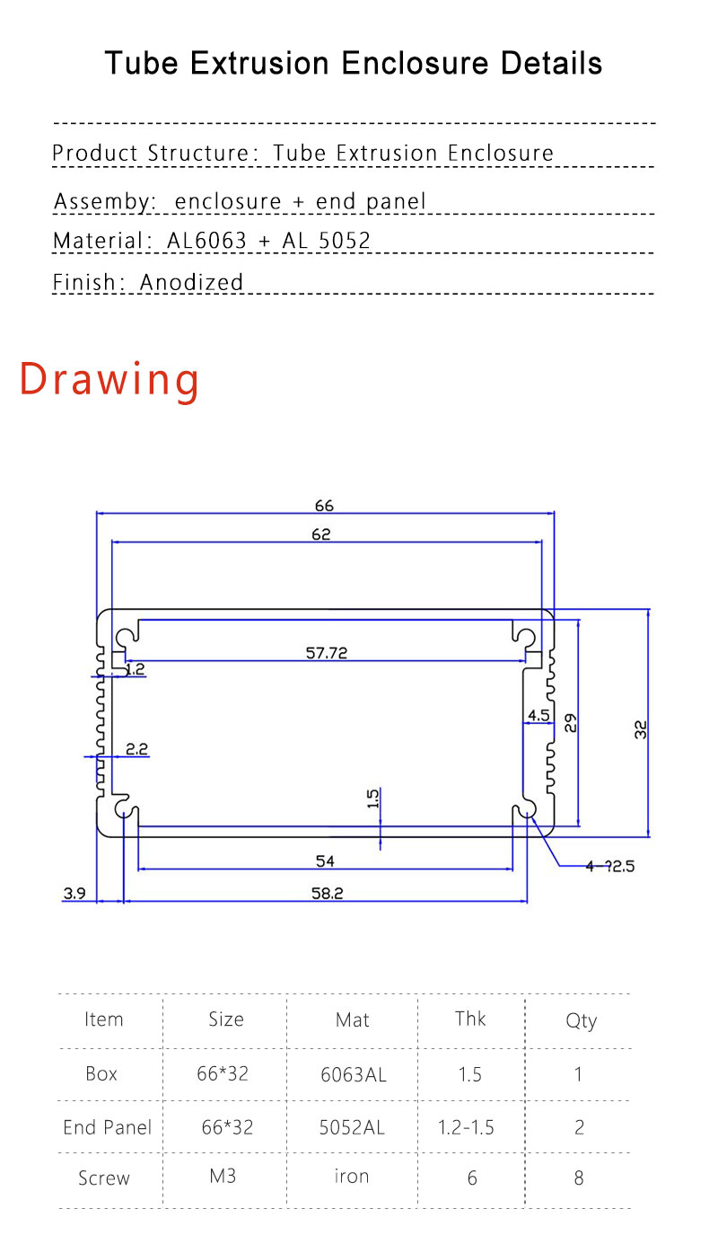 66*32Extrusion aluminum pcb instrument box case project enclosure electronic diy